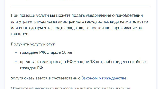 На Госуслугах заработала новая опция, которая называется «Уведомление о приобретении гражданства иностранного государства». Нажав на эту строчку в меню, можно сообщить также о виде на жительство. Прогресс очевиден, ведь раньше это нужно было делать через почту или структуры МВД, а летом 2023 года Министерство иностранных дел предложило гражданам РФ передавать информацию через дипломатические представительства за границей.