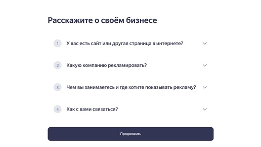 Эта инструкция поможет вам создать рекламную кампанию и заполнить кабинет, чтобы продвижение было эффективным Перейдите на страницу подключения рекламы. Вы увидите несколько вопросов — ответьте на них, чтобы создать рекламную кампанию. Может быть так, что не на все вопросы получается ответить. Например, если у вас нет сайта или ваш бизнес нельзя добавить в Карты. Это не помешает запустить рекламную кампанию. Например, сайт компании, интернет-магазин, телеграм-канал, сообщество ВКонтакте или страницу на маркетплейсе...