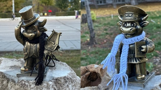В Энгельсе местная жительница по имени Елена подарила городу душевный сюрприз, утеплив вязаными шарфиками четыре бронзовые скульптуры бычков — символы туристического маршрута «Энгельс-Трек». Жительница поделилась новостью в сообществе социальной сети ВКонтакте "Энгельс онлаин". Елена, недавно переехавшая в город, призналась в соцсетях, что уже успела полюбить его всей душой и решила «привнести капельку красоты» в городское пространство. Она предложила горожанам развивать традицию: если кто-то захочет забрать вещицу «на счастье», то стоит «нарядить» бычка взамен...