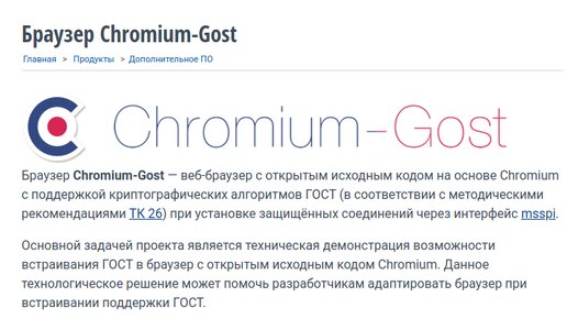 Мне как ИП приходится работать с электронно цифровой подписью, сайтом налоговой (ФНС) и Госуслугами. Поиски подходящего браузера для этих целей привели меня к браузеру Chromium-Gost (Хромиум-ГОСТ) рекомендованный компанией КриптоПро. Браузер лёгкий, быстрый подойдёт тем, кому по каким либо причинам не подходит Яндекс браузер (для меня он слишком перегружен буквально всем). Вот, что написано на сайте КриптоПро: "Браузер Chromium-Gost — веб-браузер с открытым исходным кодом на основе Chromium с поддержкой...