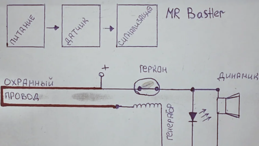 Сегодня мы соберём схему сигнализации без микросхем и прочих наворотов. Всё просто и функционально. Главной деталью нашей схемы является геркон с нормально замкнутыми контактами. На нём намотана катушка 300 витков проводом 0.08мм. Один из выводов идёт на плюс другой на минус. Геркон идёт в разрыв минуса. Далее идёт звуковой генератор, либо генератор импульсов. Который будет нам сигнализировать о проникновении в помещение, звуком или световым сигналом. В нашем случае и тем и другим, в качестве генератора я использовал плату с китайской игрушки...