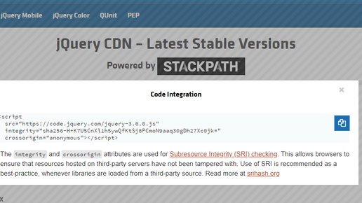 Эта статья вряд ли кому пригодится, но если среди читателей есть совсем новички, я буду ссылаться на неё из других статей в будущем, поехали. Есть несколько вариантов подключить скрипт, он может быть размещен у вас на компьютере, хостинге или на CDN. В любом случаи в первую очередь нам нужно получить путь или ссылку на этот файл. Возьмем для примера подключение jQuery. На официальном сайте мы можем скачать библиотеку или же воспользоваться CDN. Выбрав способ через CDN, мы кликаем на необходимую версию jQuery и нам сразу предлагают скопировать html код для вставки на сайт...