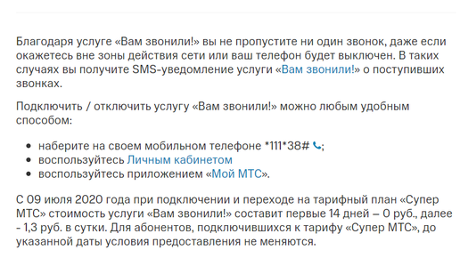 Мобильный оператор МТС провел изменения на тарифе «Супер МТС» - с 9 июля 2020 для новых пользователей тарифа услуга «вам звонили» стала платной. Тех, кто подключил тариф до 9 июля, данное изменение не затронуло...
