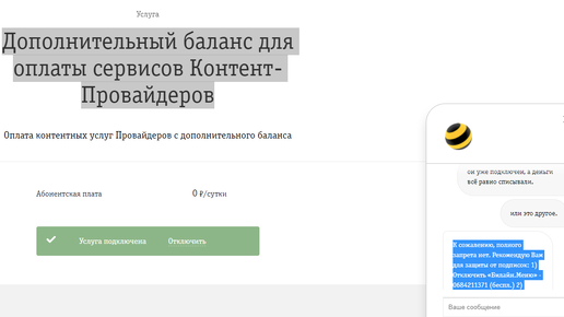 Обратился ко мне дедушка с билайном, списывали деньги за подписку, хотя была подключена услуга "Дополнительный баланс для оплаты сервисов Контент-Провайдеров" На корпоративной симке есть услуга "Запрет доступа ко всем СМС-сервисам Провайдеров", но как её подключить - нигде никакой информации. Она была подключена по умолчанию. Написал в чат через личный кабинет, что нужно подключить этот запрет. И вот что оператор ответил: "К сожалению, полного запрета нет. Рекомендую Вам для защиты от подписок: 1) Отключить «Билайн...