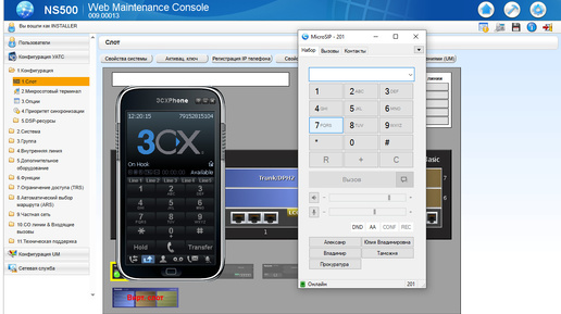 Подключение SIP-телефона к АТС Panasonic KX-NS500 мы будем рассматривать на примере софтфона MicroSIP. Мы уже о нем упоминали. Но по аналогии с ним можно подключить любой SIP-телефон к станции Panasonic. Что нужно для подключения SIP-телефонов к АТС Panasonic? Давайте установим в АТС виртуальную плату расширения для SIP-телефонов. Заходим в виртуальный слот и перетягиваем мышкой карту V-SIPEXT32 в желтую половину. Подводим курсор мыши к установленной плате, и в выпадающем меню выбираем Свойства порта...