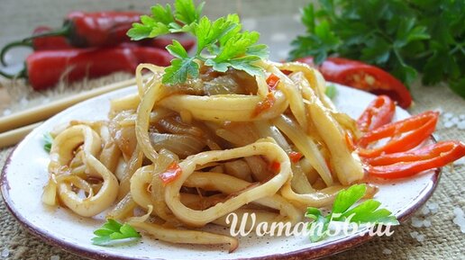 Морепродукты, как правило, готовятся очень быстро и, благодаря своему вкусу, практически не требуют никаких дополнений. Так, можно сделать невероятное блюдо из одних лишь кальмаров и репчатого лука, и займет это, включая очистку моллюсков, не более 7-8 минут. Сегодня на столе кальмары с луком на сковороде. Особую пикантность блюду придает добавление свежего жгучего перца, но при желании можно обойтись и без него, заменив на более традиционный черный перец. Обязательно попробуйте, ну очень вкусно...