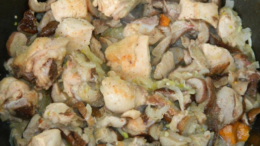 Рецепт: Как вкусно пожарить мясо курицы на сковороде с луком и грибами*