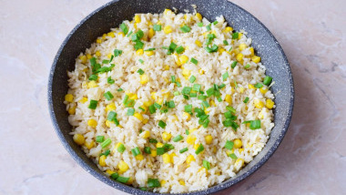 #рис #жареный #китай #коррейскаякухня #дзен #рецепты ингредиенты Изменить состав Порций:4 Рис200 гр Кукуруза200 гр Лук1 шт. Яйца1 шт. Чеснок2 зубч. Соевый соус2 стол.л. Растительное масло20 гр Зелёный лук10 гр Сольпо вкусу Специи сухие .......Для начала........ Как пожарить рис с кукурузой и яйцом? Подготовьте для этого необходимые ингредиенты. Кукурузу можно взять свежую, консервированную или замороженную. Размораживать заранее её необязательно. Рис берите пропаренный длиннозерный. Он не разваривается и получается рассыпчатый...
