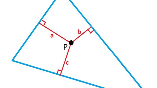 Для каждой точки P внутри треугольника измерьте расстояния до сторон треугольника a, b и c, как показано на рисунке, и вычислите сумму a+b+c. Если эта сумма одинакова для всех точек треугольника, то...