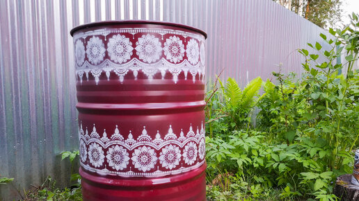 Давно мечтала облагородить бочку на даче. У меня их две, одна используется под огурцы, вторая- под сжигание мусора. Покажу, как я их покрасила. 1. Вот в такой бочке выращивала огурцы, вид обычный. Местами эмаль сошла и проявились ржавые пятна. Бочку помыла, обезжирила, красила грунт-эмалью из баллончика. При помощи трафарета сделала красоту. Совсем другое же дело? :) Процесс переделки смотрим на видео. 2 . Вторая бочка для сжигания мусора. Ее я покрасила немного другим способом, но она тоже получилась красавицей...