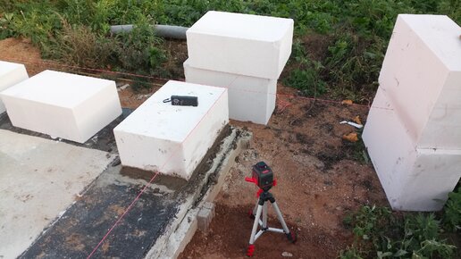 Первый ряд кладки газоблока на плиту. Погнали стены в высоту.