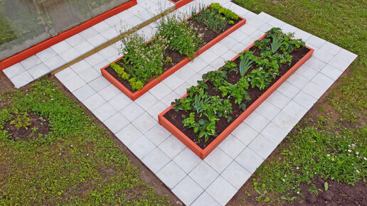 Плитка в нашем мини-огороде планировалась с самого начала. Поэтому при постройке и установке грядок сразу же был учтён размер будущих плиток 30х30: При укладке плитки я решил отступить от общепринятой технологии. Обычно вниз укладывают геотекстиль, сверху песок, потом плитку. Геотекстиль нужен для того, чтобы песок не смешивался с грунтом и не расплывался под плиткой. Однако если делать именно так, то геотекстиль не защитит от прорастания травы и сорняков между плитками, корни растений будут прекрасно жить в слое песка...