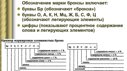Бро́нза — это сплав меди другими металлами и элементами, например с оловом, алюминием, кремнием, бериллием, свинцом, марганцем и др. Прежде всего бронзу можно разделить по способу изготовления: на литейную (чушка, отливки) и обрабатываемую давлением (металлопрокат). Расшифровка марок бронзы проста: Бр —  обозначение, что это бронза, далее следуют большие буквы названия металлов (О — олово, А — алюминий, Ж -железо, Мц -марганец, Ф -фосфор), цифры обозначают процентное содержание этих металлов (например, бронза БрАЖНМц9-4-4-1 содержит 81-82% меди, по 4 % железа и никеля и 1 % марганца)...