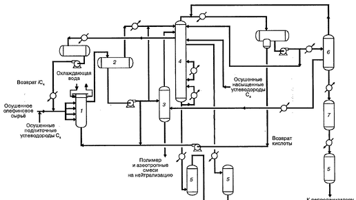 Алкилировать изобутан олефинами затруднительно, потому что процесс характеризуется, помимо прочего, множеством побочных реакций: 1. Продукты первичной реакции - это изомерные парафины, которые содержат атомы углерода, принадлежащие как изобутану, так и соответствующему олефину. 2. Происходят и такие вторичные реакции, как: что приводит к получению вторичных продуктов, которые могут быть как легче, так и тяжелее исходных. Факторы, ускоряющие механизмы первичной и вторичных реакций, различны, как и их восприимчивость к изменениям рабочих параметров или вариантам технологического оформления...