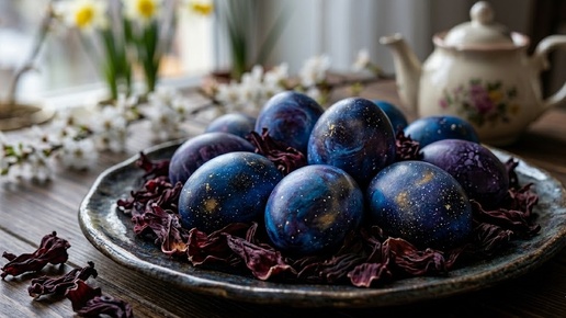 Если вам надоели скучные наклейки и ядовито-розовые красители из магазина, попробуйте этот способ. Я сама сначала не поверила, что из пачки дешевого чая получится ТАКОЕ. Яйца выглядят как драгоценные камни или осколки метеорита — глубокий синий, фиолетовый и серый в одном флаконе. Коротко о главном: Если вам нравится матовый «каменный» вид — оставляйте так. Но если хотите, чтобы они сияли, капните на ватку каплю обычного растительного масла и слегка протрите уже полностью высохшие яйца...