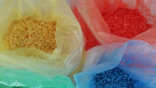 Первым делом следует определиться с выбором крупы. У меня это рис круглозерный шлифованный. Лучше выбирать крупу светлых оттенков - так краска будет ложиться ровнее, а оттенок будет виден ярче. Пересыпаем крупу в чистые ПЭТ пакеты. Их количество зависит от количества выбранных вами цветов краски. Я красила свою крупу в 4 основных цвета базового спектра: красный, желтый, синий и зеленый. Берем акриловые, пищевые или любые другие краски (от их выбора зависит стойкость и плотность цвета) и капаем понемногу в каждый пакетик...
