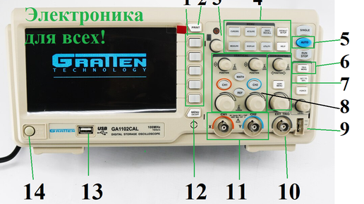 Для многих начинающих радиолюбителей осциллограф предстаёт сложным неизведанным устройством. У кого-то в воспоминаниях огромные советские осциллографы с лучевой трубкой, которые на уроках физики показывал учитель. У кого-то современные навороченные, где непонятно куда нажимать...Сегодня каждый из вас научится пользоваться осциллографом! Даже новичок! А тот, кто уже умеет, узнает некоторые полезные функции, часто используемые на практике. Наш обучающий материал будет об очень популярной модели -GA1102CAL,...