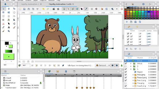Synfig Studio — это бесплатное программное обеспечение для 2D-анимации с открытым исходным кодом, разработанное как мощный инструмент для создания анимации с использованием векторной и растровой графики. Synfig устраняет необходимость рисовать анимацию «по кадрам», что значительно снижает затраты ресурсов на создание мультфильмов. Пятая версия этой неплохой программы позволяет работать даже со звуком. Программа подходит для детской анимационной студии. В свободном доступе. Не рекомендую пользоваться ранними версиями по причине недоразвитого интерфейса программы в начале разработки программы...