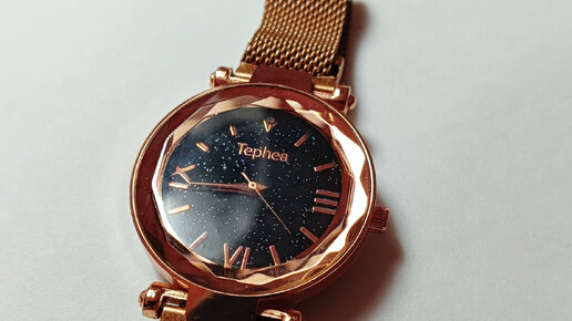 Доброго времени суток! Буду менять батарейку в таких вот симпатичных часиках. Часы с магнитным браслетом - кстати довольно удобно, можно легко отрегулировать под нужный размер руки, и магнит достаточно сильный, хорошо держит. Открыл крышку-хлопушку - достаточно тугая. В часах установлен самый обычный кварцевый механизм. Немного отвел пружинный фиксатор и старую батарейку можно легко вынуть...