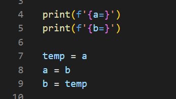 Первый способ - временная переменная: Записываем во временную переменную temp значение a. В а записываем значение b. В b записываем значение временной переменной temp. Второй способ - распаковка с присваиванием: В данном случае инструкция присваивания повторно связывает переменную a со значением, на которое ссылалась переменная b, а переменную b со значением, на которое ссылалась переменная a Третий способ - побитовый оператор XOR: Для этого способа надо вспомнить, что XOR возвращает единицу, если один из двух бит равен единице, а второй нулю...
