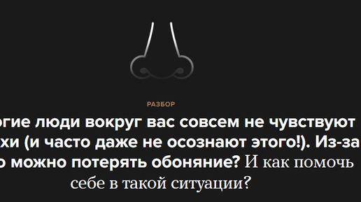 5 карточек 1 Наступил сезон простуд. В числе прочего это значит, что многие люди скоро столкнутся с потерей обоняния — аносмией. И к кому-то оно не вернется еще очень долго или даже никогда. Тех, кто по разным причинам лишен обоняния, довольно много. По некоторым данным, у 22% людей есть какие бы то ни было нарушения обоняния (например, та же аносмия или плохая чувствительность к запахам). Причем люди могут долгое время даже не осознавать этого. Причиной, кроме вирусной респираторной инфекции (в том...
