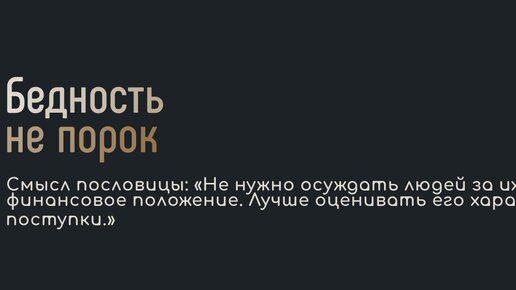 Бедность не порок – смысл поговорки Введение Бедность, часто воспринимаемая как негативное явление, столкновение с которым часто вызывает беспокойство и сочувствие. Однако в мудрых словах "Бедность не порок" заключается глубокий философский смысл, который предлагает нам пересмотреть наше отношение к этому явлению. Вместо того чтобы осуждать людей за их финансовое положение, мы пригашаем оценить их характер и поступки. Разберем, что именно делает эту пословицу такой актуальной и значимой для современного общества...