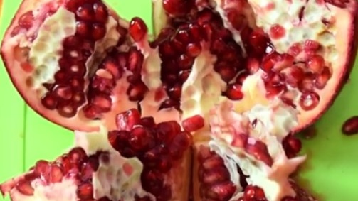 Для того, чтобы быстро очистить гранат сначала надрезаем верхушку и осторожно снимаем ее рукой. Видим, что гранат разделен на секции - это белые продольные перепонки. Теперь назрезаем кожицу граната параллельно этим переронкам...