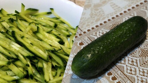 Для некоторых салатов требуется уметь резать огурцы соломкой. И сегодня я вас научу, как это делать. Благодаря этому способу нарезки, вы сможете легко нарезать огурцы тонкой соломкой для салатов. Отберём хорошие свежие огурцы и вымоем. Сначала нужно у огурца отрезать наискосок хвостики. Затем параллельно срезу нарезаем огурец на тонкие пластинки...