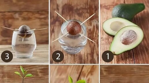 Посмотрите, как посадить авокадо косточкой: достаньте косточку из мякоти и дайте ей немного подсохнуть. Проколите её зубочистками и поместите в стакан, чтобы косточка авокадо частично погрузилась в воду...