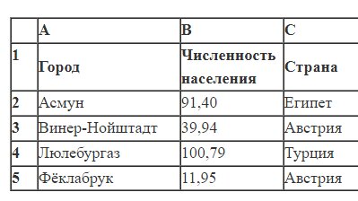 В электронную таблицу занесли данные о численности населения городов разных стран. Ниже приведены первые пять строк таблицы. В столбце A указано название города; в столбце B –– численность населения (тыс. человек); в столбце C –– название страны. Всего в электронную таблицу были занесены данные по 1000 городов. Порядок записей в таблице произвольный. Выполните задание. Откройте файл с данной электронной таблицей (расположение файла Вам сообщат организаторы экзамена). На основании данных, содержащихся