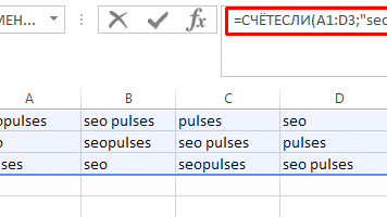 Функция СЧЕТЕСЛИ в Excel позволяет посчитать количество сочетаний символа, слова, цифры или фразы в выбранной области, что может быть полезно для подсчета повторений. Функция СЧЕТЕСЛИ в Excel Для примера имеется определенное количество ячеек и нужно найти количество повторений определенного слова в этом случае можно использовать конструкцию: =СЧЁТЕСЛИ(A1:D3;»seopulses») Все готово Массовый поиск сочетаний В этом случае потребуется сначала скопировать весь список поиска в отдельный столбец...