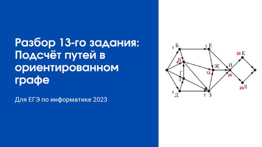 В 13-ом задании Вам необходимо подсчитать количество путей, ведущих из одной вершины в другую. Для этого Вам достаточно освоить один простой способ, описанный ниже. Рассмотрим задание из демоверсии ЕГЭ 2023: Что нам напоминает это задание? Правильно: рассмотренное ранее первое задание ЕГЭ по информатике. Здесь тоже имеется граф-схема, изображающая города буквами, а дороги - линиями. Единственное нововведение в схеме в том, что теперь мы можем перемещаться по дороге только в одном направлении, указанном стрелкой...