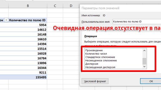 В сводных таблицах можно подводить итоги по очень многим параметрам, но простой подсчет уникальных записей по дефолту там не представлен. Идем в параметры и не увидим числа уникальных записей: Из относительно похожего там только Количество чисел. Это явно не наш вариант. Но все меняется, если при построении таблицы...