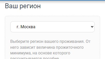 Начнём с того, что единое пособие выплачивается только если среднедушевой доход семьи меньше прожиточного минимума на душу населения в регионе. Размер пособия - 50%, 75% или 100% от размера прожиточного минимума на детей в регионе. Другие требования по имуществу я не рассматриваю, предполагая что семья им соответствует. Используя этот калькулятор единого пособия, можно примерно узнать, на какой размер пособия вы можете рассчитывать. Пользоваться калькулятором просто. Во-первых, нужно выбрать регион...