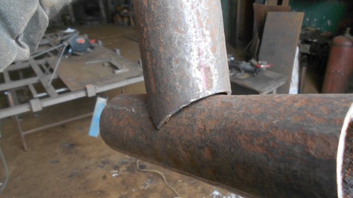Ищут вот эту информацию, фото вверху. Хотят узнать способ соединения труб таким образом, чтобы эта врезка была без зазоров. То есть нужен вырез в торце одной из труб, торец этот потом вставляется перпендикулярно оси плоскости другой трубы. Короче, врезка под прямым углом. Как посчитать и начертить эти вырезы? Покажу простой метод в гараже дома на даче, делается на коленке без сложных расчётов и формул. Чтобы сделать врезку трубы в трубу нужно сделать в торце трубы запилы болгаркой. Данные запилы будут иметь следующую конфигурацию...