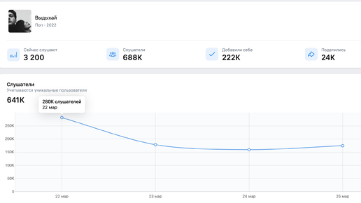 За все время существования топ-чарта ВКонтакте было много предположений об алгоритмах работы и за все это время эти алгоритмы менялись и совершенствовались. Но можем сказать точно, что прослушивания в чистом виде и их количество не влияют на позицию в топ чарте и это подтверждает наш последний кейс c Три Дня Дождя и Zivert. Внимание головоломка! В первый день мы собрали 280к уникальных слушателей по студии и 250к по общей статистике от UMA, зашли на 29 место, на второй день собрали - 178к слушателей...