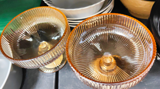 Столько всего нового появилось в Фикс Прайс, последняя поставка товара богата на новинки. Только посмотрите, какие вазочки из новой кухонной серии расставили на полке. Яркие, чем-то напоминают янтарные, потому что золотистые, с перламутровым переливом. Покажу поближе, новинки разные. Вазочка - это креманка. Стеклянная, на крепкой невысокой ножке. Берут такие вазочки для мороженого, для фруктов, ягод, и для десерта, можно использовать вместо конфетницы. Действительно с переливом, это особенность стеклянной посуды из коллекции Жар-птица...
