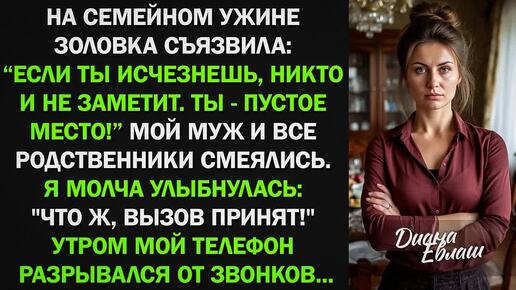 На семейном ужине золовка съязвила: "Если ты исчезнешь, никто не заметит!" Все смеялись...