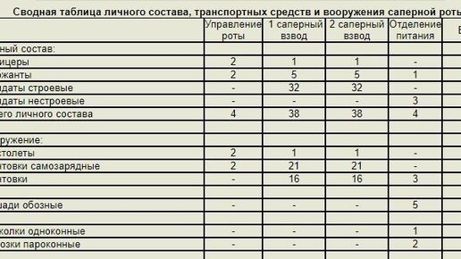 Для использования других методов для борьбы с танками, в распоряжении командира полка было ещё одно полезное подразделение. Это сапёрная рота. В штате она была как до начала войны, так и перекочевала в новый, без каких-либо изменений. Почему я не упомянул про сапёров раньше? Расскажу по ходу, а пока штат. Саперная рота. Личного состав - 84 человека. Командного и начальствующего состава - 4. Младшего командного и начальствующего состава - 13. Красноармейцев - 67. Лошадей обозных - 5. 1. Управление роты Командир роты - капитан (пистолет, бинокль, компас)...