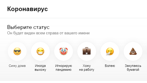 Для этого Вам нужно перейти на данную страницу "COVID-19" с телефона или компьютера и выбрать статус соответствующий Вашим занятиям на карантине . Ваша задача только клацнуть на любой подходящий Вам эмодзи и оно автоматически появится на Вашей странице Вконтакте ...