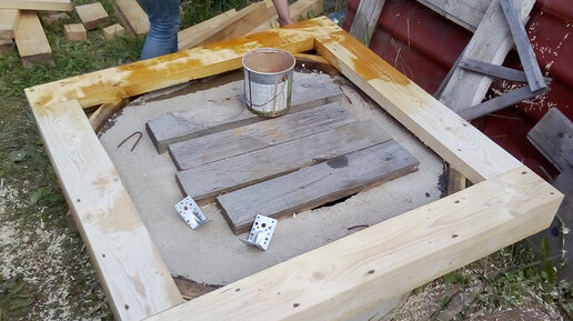 Самое главное основа, (фундамент), которой для дачного туалета в большинстве случаев служит верхнее кольцо септика: На кольцо заподлицо с верхней крышкой одевается плотно прилегающий к краям кольца короб. Его удобно делать из обрезных досок на ребро. Чтобы получить уровень, снизу этот короб подпирается брусочками. Затем короб фиксируется шляпками глухарей на кольце, чтобы он не сползал вниз. После этого по коробу делается второй ярус обвязки. Для этого также удобны обычные обрезные доски, которые укладываются плашмя...