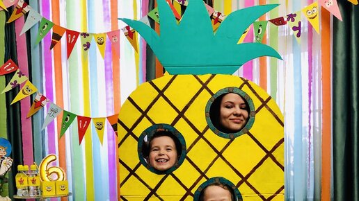 День рождения сына мы оформляли в стиле «Губка Боб Квадратные Штаны». Пришла идея сделать дом Губки Боба - Ананас. В нем есть окошки а значит он послужит не только отличным декором для праздника но и фотостендом.