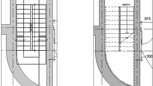 1. Построим монолитное перекрытие с опиранием на стену 150 мм: ДП: Планы этажей – УРОВЕНЬ 1; ИП > АРХИТЕКТУРА > СТРОИТЕЛЬСТВО > ПОЛ/ПЕРЕКРЫТИЕ; ПП: СМЕЩЕНИЕ = 150; Постройте замкнутый контур эскиза перекрытия, щелкнув на внутренней линии каждой наружной стены (следите за пунктиром, он должен быть внутри стены). ПРИНЯТЬ ЭСКИЗ. Перед тем, как построить лестницу, необходимо определить ее параметры и нанести вспомогательные линии. Итак: высота этажа = 3300, ширина проступи = 300, высота подступенка = 150, 1 марш – 10 ступеней, ширина марша = 900...