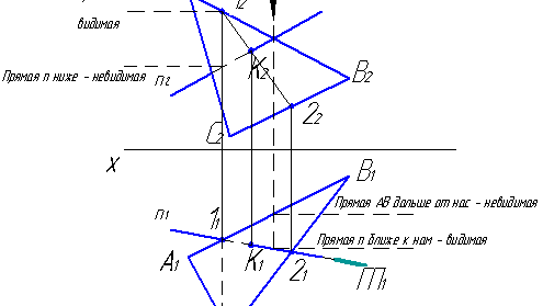 § 7. Первая позиционная задача. Построение точки пересечения прямой линии с плоскостью Задача 7.1. Построить точку пересечения прямой п с плоскостью треугольника АВС. Определить видимость прямой п. (Рисунок 101) Решение. Задачи данного типа решаются в три этапа: 1. Проведение через заданную прямую вспомогательной проецирующей плоскости и нахождение линии пересечения этой вспомогательной плоскости с заданной плоскостью. 2. Построение точки пересечения прямой и плоскости, опираясь на результат этапа 1...