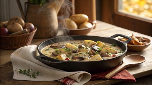 Это то самое блюдо, которое возвращает в детство, когда на кухне шумела сковорода, а бабушка пробовала соус на ложке и говорила: “Ещё минутку — и готово!” Картофель по-домашнему с грибами и сметаной — простое, но по-настоящему душевное блюдо, в котором всё сошлось: сытность, аромат и уют.