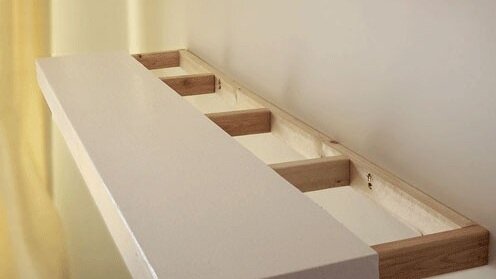 Навесные полки со скрытым креплением (их еще называют плавающие) прекрасно вписываются в любой интерьер, не перегружают его зрительно и выглядят при этом очень легко и парящей. На таких полках можно хранить книги, сувениры, цветы и прочие мелочи. Совсем не обязательно их покупать в магазине. Этот мастер класс как раз о том, как сделать такие полки своими руками. Что вам понадобится шлифованная фанера толщиной 8 мм, сосновые брусочки 1-1,5 на 2 см длиной ок. метра, ножовка по дереву, наждак, краски (в данном варианте глянцевая белая), саморезы, шуруповерт (отвертка), кисти, уровень...