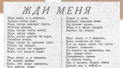 Стихотворение «Жди меня», наверно, стало одним из самых популярных в военное время. Произведение отправляли в письмах, вырезали из газет, листочки бережно хранили в карманах гимнастерок. Стихотворение-посвящение, стихотворение-легенда «Жди меня» стало родным для каждого бойца Великой Отечественной. Всякий раз, когда его переписывали от руки, оно словно перерождалось — солдаты вкладывали в него свою любовь, свои мысли, свою боль и надежду на возвращение и встречу с родным человеком. Стихотворение Константина Симонова «Жди меня» было опубликовано в феврале 1942 года в газете «Правда»...