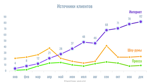 Инструкция как сделать самому в Excel. Линия — это одна из самых наглядных форм представления данных. Мозг анализирует угол наклона линии и делает выводы о силе роста или падения. Рассмотрим типичный график из трех линий и 5 ошибок которые делают в офисе. Андрей менеджер отдела маркетинга в компании. Задача Андрея выступить перед директором и коллегами с презентацией. У него есть данные какие каналы приводят клиентов, и он простроил стандартный график в Excel: Когда Андрей выведет слайд его не...