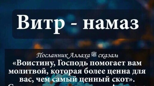 Намазы-сунна бывают двух видов: совершаемые в коллективе и совершаемые индивидуально. Вначале рассмотрим намазы-сунна, совершаемые индивидуально, не разделяя их с точки зрения причин и времени. Намаз-витр – это желательный (сунна) намаз с нечётным (витр) количеством ракаатов, совершаемый в период после ночного намаза до наступления времени утреннего намаза. Если тот, кто находится в пути (мусафир), ночной намаз перенёс и совершил вместе с вечерним, то он может после него совершить и намаз-витр, не дожидаясь наступления времени ночного намаза...