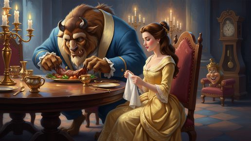 Помните сцену из мультфильма, где Чудовище хватает еду когтями, а Белль спокойно достает салфетку? Вот она — квинтэссенция хороших манер в действии. Никаких нравоучений, никакого высокомерия. Просто показала, как надо. А ведь девушка находилась в замке против своей воли. Вокруг — говорящая мебель, хозяин-монстр с клыками, полная изоляция от мира. Любая другая на её месте либо впала бы в истерику, либо забила бы на все условности. Но Белль продолжает вести себя так, будто сидит за семейным ужином в родной деревне...